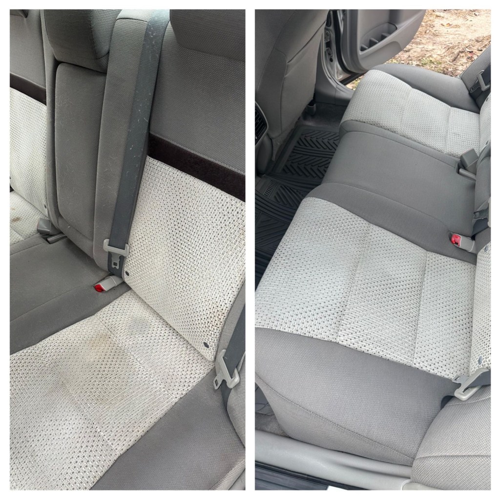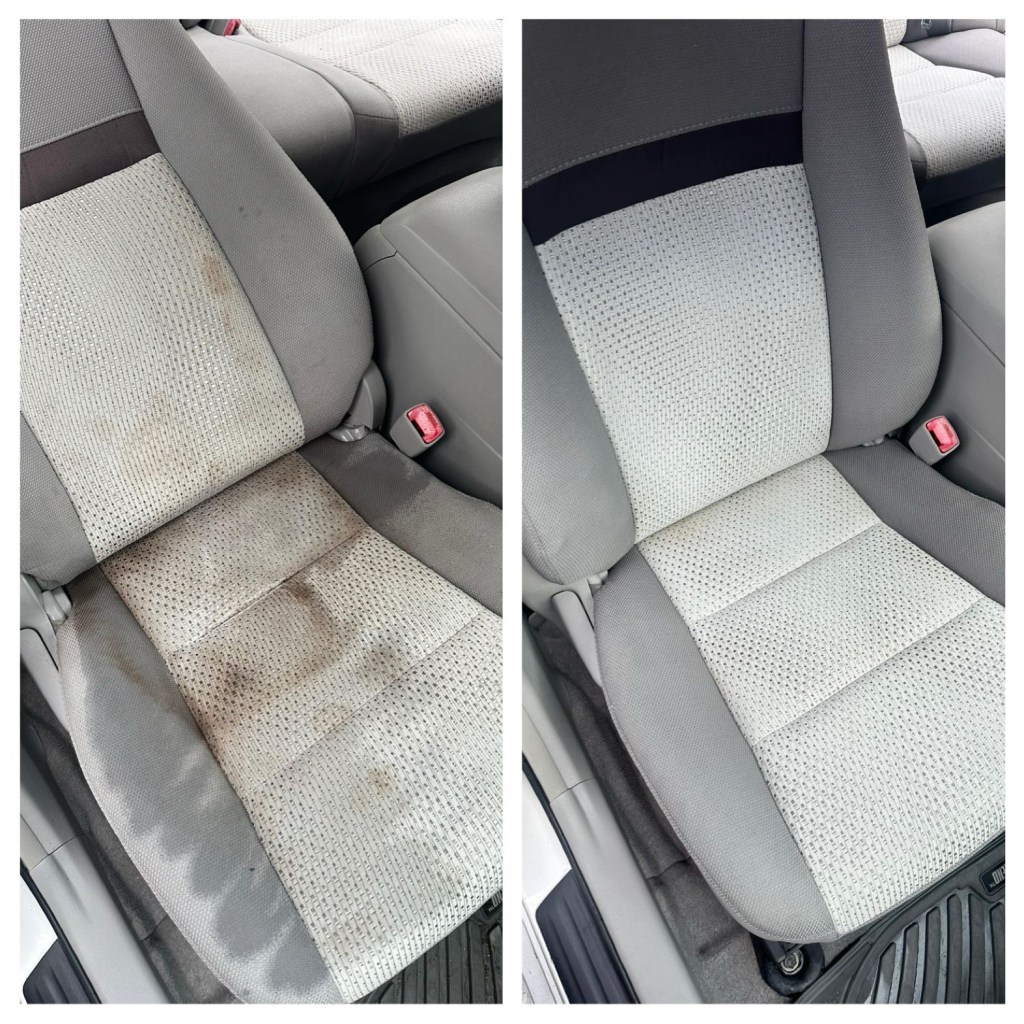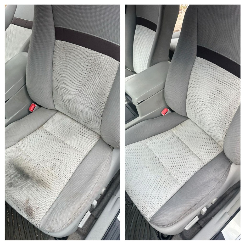 These seats had years of embedded dirt, grime, pet odor, pet hair, and even a nasty baked-in hot chocolate stain on the passenger seat⦠but none of that stood a chance against my detailing skills.